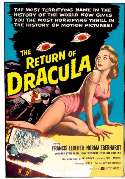 The Return of Dracula, directed by Paul Landres (The Vampire) from Pat Fiedler's script, co-stars Ray Stricklyn (The Lost World), Virginia Vincent (The Hills Have Eyes), John Wengraf (The Pride and the Passion), Gage Clarke (The Bad Seed), Jimmy Baird (The Black Orchid) and Greta Granstedt (They Never Come Back)."