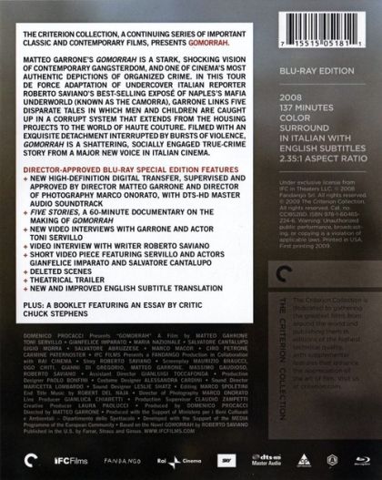 An inside look at Italy's modern-day crime families, the Camorra in Naples and Caserta. Based on a book by Roberto Saviano. Power, money and blood: these are the "values" that the residents of the Province of Naples and Caserta have to face every day. They hardly ever have a choice and are forced to obey the rules of the Camorra. Only a lucky few can even think of leading a normal life.
