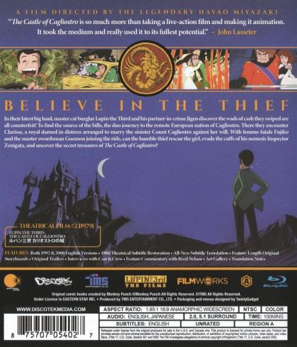 After a successful robbery leaves famed thief Lupin III and his partner Jigen with nothing but a large amount of fake money, the so called "Goat Bills", he decides to track down the counterfeiter responsible - and steal any other treasures he may find in the Castle of Cagliostro, including the 'damsel in distress' he finds imprisoned there.