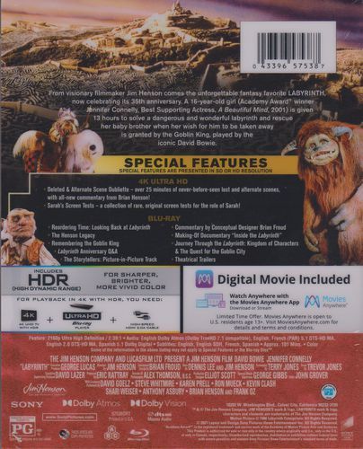 Frustrated with babysitting on yet another weekend night, Sarah, a teenager with an active imagination, summons the Goblins to take her baby stepbrother away. When little Toby actually disappears, Sarah must follow him into a fantastical world to rescue him from the Goblin King. Guarding his castle is the labyrinth itself, a twisted maze of deception, populated with outrageous characters and unknown dangers.