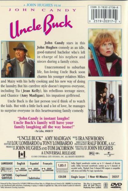 As an idle, good-natured bachelor, Uncle Buck is the last person you would think of to watch the kids. However, during a family crisis, he is suddenly left in charge of his nephew and nieces. Unaccustomed to suburban life, fun-loving Uncle Buck soon charms his younger relatives Miles and Maizy with his hefty cooking and his new way of doing the laundry. His carefree style does not impress everyone though - especially his rebellious teenage niece, Tia, and his impatient girlfriend, Chanice. With a little bit of luck and a lot of love, Uncle Buck manages to surprise everyone in this heartwarming family comedy.