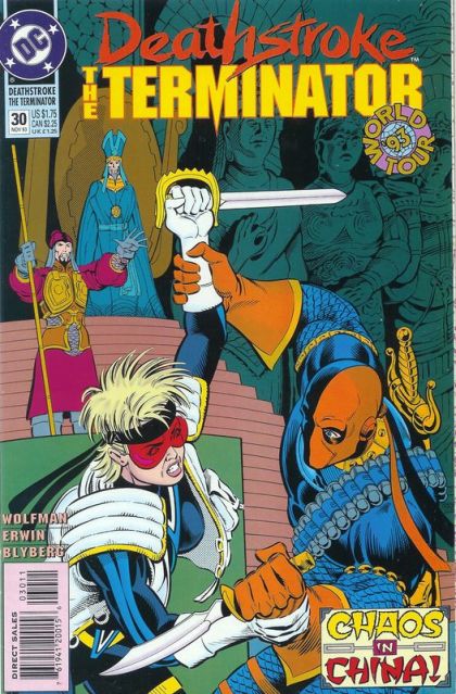 World Tour '93: Part 4 of 8. "China!" Guest-starring Vigilante. Story by Marv Wolfman. Art by Steve Erwin and Will Blyberg. Slade and his associates continue their search for Addie in China and come face-to-face with Deathstroke's erstwhile rival and lover - Vigilante! Cover price $1.75.