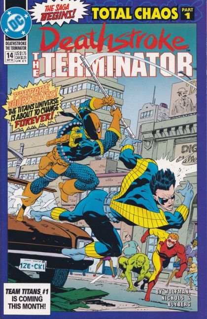 Total Chaos: Part 1 of 9. "Child's Play!" Guest-starring the New Titans. Story by Marv Wolfman. Art by Art Nichols and Will Blyberg. Cover by Mike Zeck. Deathstroke the Terminator is wanted by the law and is on the run. The Titans, a group of heroes Slade has fought against and along side, is in hot pursuit. Story continues in New Teen Titans (1984-1996 2nd Series) #90. Cover price $1.75.