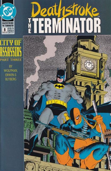 City of Assassins: Part 3 of 4. "The Allies!" Guest-starring Batman. Story by Marv Wolfman. Art by Steve Erwin and Will Blyberg. Cover by Mike Zeck. The man known as the Terminator continues his quest to protect a man from the crime bosses of Gotham City. Working against each other didn't work. Perhaps Deathstroke and Batman will have more success as partners. Don't miss the team-up you never thought you'd see. Cover price $1.75.