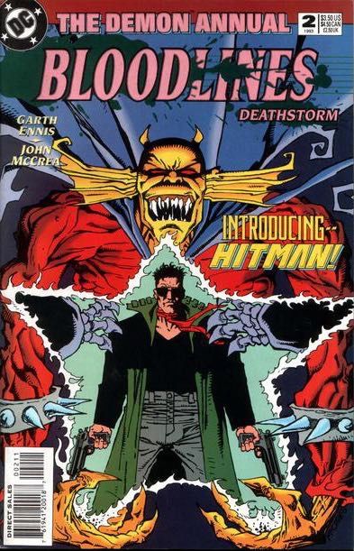 The BLOODLINES Summer Annual crossover event continues from Eclipso Annual (1992) #1. The Demon tastes New Blood when Gotham mob assassin Tommy Monaghan, en route to score a hit against a rival gang leader, is attacked by one of the alien parasites and becomes the well-armed Hitman (1st appearance), this Annual's infusion of New Blood in the DC Universe. BLOODLINES continues in Batman Legends of the Dark Knight Annual (1991) #3. Written by Garth Ennis, with art and cover by John McCrea. Cover price $3.50.