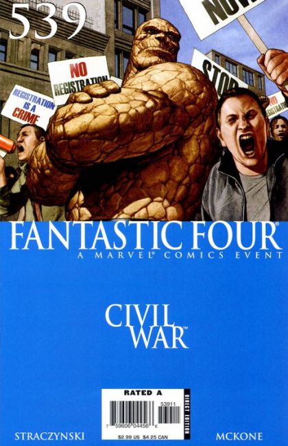 As the Civil War rages, the Thinker and the Puppet Master have cooked up a scheme to eliminate a large number of heroes all at once. They feed Captain America's side information about the Government's prisoner transportation, to ensure that he'll be able to attack it. With both sides fighting each other, the Puppet Master can control all of the non-super-powered people nearby to cause chaos, and attempt to destroy the transports while the captive heroes are still inside. Ben Grimm is caught in the middle of the conflict, and is the only one to figure out what's going on. When a member of the Yancy Street gang is killed by the explosion, Ben makes his decision... he doesn't believe in the registration act and can't support it, but won't fight against the government either so he decides to leave the country.