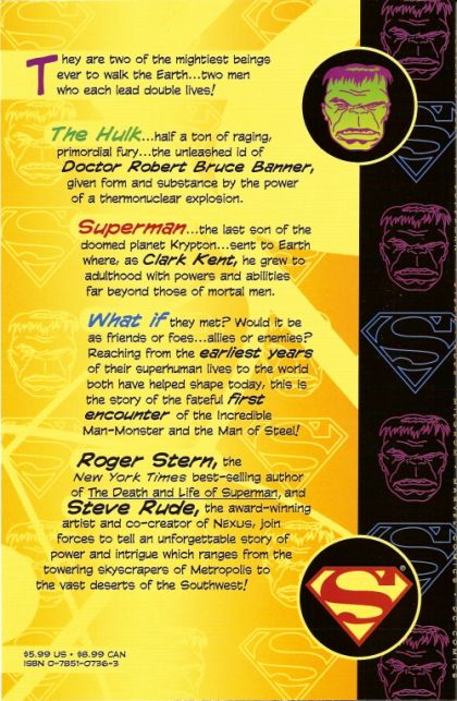 "Double Lives!" Story by Roger Stern. Art by Steve Rude and Al Milgrom. One is half a ton of primordial rage and fury and the product of modern science. The other is the last son of the doomed planet Krypton and endowed with abilities far beyond those of mortal men. Rendered in nostalgic 1950's-style artwork, this book tells the tale of "What if these two met?" What if these comic book icons had been born under the same banner? What will happen when the man-monster known as the Hulk, the strongest one there is, meets Superman, the Man of Steel and perhaps the greatest superhero of them all?