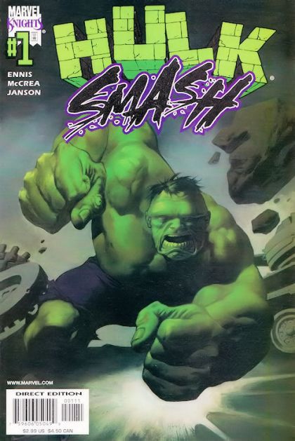 Cover says Hulk Smah - painted cover by kevin nowlan garth ennis/john mccrea ? THE SCOOP: The demented duo of Garth Ennis (PUNISHER) and John McCrea (Hitman) unleash the green goliath! ? THE STORY: Meet Patrick D. Mitchell. His father was awarded the Silver Star for his service in Viet Nam. His grandfather died during General Patton's drive to the Rhine during WWII. It's even rumored that one of his relatives charged up San Juan Hill with Teddy Roosevelt. Today it's Patrick's turn to face his destiny. For today his Company in the U.S. Army's 29th Infantry will lock and load, say their prayers, and face down the living engine of destruction known as the Hulk. And in the blazing heat of the Nevada desert, Mitchell will feel the cool grip of Death around his throat... and the breath of the strongest creature to ever walk the Earth on his neck. Patrick D. Mitchell is a Lieutenant. But today he just may learn what it means to be a soldier. ? THE FORMAT: Each issue of this two-issue, monthly limited series will be 32 pages, with ads. FC (1 of 2) Cover price $2.99.
