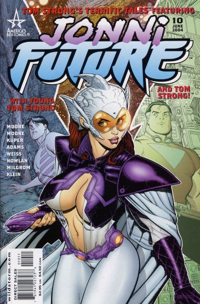 WRITTEN BY ALAN MOORE AND STEVE MOORE; ART BY PETER KUPER, ARTHUR ADAMS, KEVIN NOWLAN, ALAN WEISS AND AL MILGROM; COVER BY ADAMS (NOTE: No Bruce Timm art); COVER BY WEISS. Peter Kuper, maestro of graphic impressionism, collaborates with the legendary Alan Moore for an urban jungle tale of Tom Strong! Plus, in Part 2 of "Jonni Future," Arthur Adams and Bruce Timm once again provide the delightful delineatio's of our delectable heroine, while Alan Weiss brings young Tom Strong ever closer to maturity in a third captivating tale! FC, 32 PG. $2.95 Cover price $2.95.