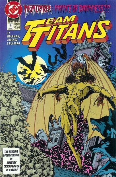 The Darkening Night!: Part 3 of 4. "Bloodlight!" Guest-starring Donna Troy. Story by Marv Wolfman. Art by Phil Jimenez and Will Blyberg. Mirage is in love with the Nightwing from the future. However, this Nightwing has been corrupted and is now the sinister villain known as Deathwing. What will happen when he gets the love-struck heroine alone? Cover price $1.00.