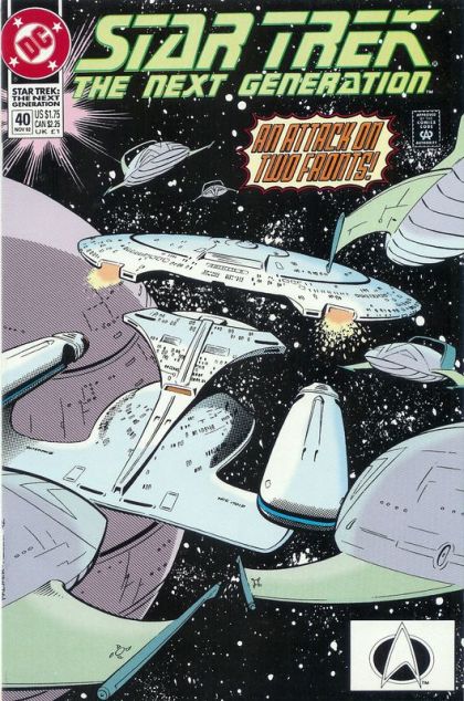 Part 2 of 6. Worf, Data and Geordi are trapped on an alien vessel while alien warships around the Enterprise grow increasingly hostile, and a worried Picard's only choice is to separate the saucer section to protect the families. Written by Michael Jan Friedman, with art by Peter Krause and Pablo Marcos. Cover by Jason Palmer and Karl Kesel. New Format. Cover price $1.75.
