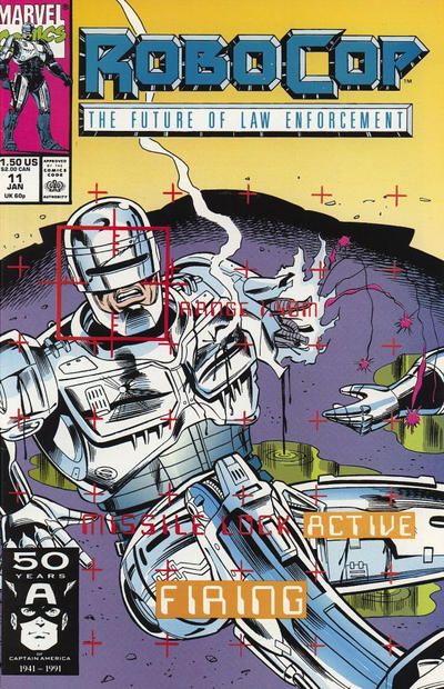 Cover by Lee Sullivan and Bob McLeod. Unfinished Business, script by Stephen Rupinski and Evan Skolnick, art by Alex Trimpe and Herb Trimpe; A deceased ex-employee of OCP named Daniel OHara is brought back to life through an experimental concept called engraming; By surviving death and the conservation of captured brain wave patterns he is reborn in the machine built by unsuspecting privately licensed scientists and called Cyberwraith; Through flashbacks, he learns that RoboCop had killed OHara then seeks revenge. 36 pgs., full color. $1.50. Cover price $1.50.