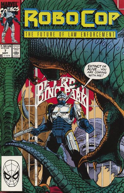 Cover by Lee Sullivan and Kim DeMulder. Robosaur, script by Alan Grant, art by Lee Sullivan and Kim DeMulder; The Detroit Dino Park opens, where families can enjoy the site of genetically recreated dinosaurs brought back to life from prehistoric times; Problem is the cages are constantly being sabotaged, leaving RoboCop to face down these towering monsters threatening the public; RoboCop interrogates the neighboring and nearly debunked robotic dinosaur theme park, Robosaur World, but discovers the saboteur is actually a Dino Park employee secretly working for Nixco. 36 pgs., full color. $1.50. Cover price $1.50.