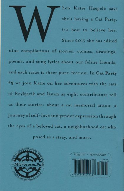 In this ninth edition of the zine Cat Party, creator Katie Haegele continues her celebration of cats and the people that love them. Bringing together short stories and art about cats from cat lovers, Haegele has curated a collection of drawings, illustrations, and reflections that are by turns moving, hilarious, and thoughtful. From a cat memorial tattoo, to a neighborhood cat posing as a stray, to Haegele's adventures with the cats of Reykjavik, any cat person will get a kick out of this cute and heartfelt zine.