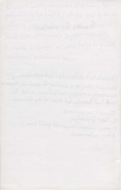 I don't know how I feel about my family. I'm tired of putting energy into relationships where no one invests back. I use this zine to explore stories of myself and my parents. I doubt they'll ever read this, but, if they/you do, I needed to make this.