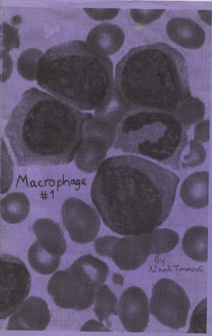 Macrophages are white blood cells that love to eat. They're indiscriminate in what they eat. I used to have swollen ankles a lot when I was a kid. Each time my joints were full of blood and other fluids the macrophages would be released and begin to eat away the fluid as the body was trying to coagulate. The macrophage didn't just eat away the blood, but also the cartilage in my joints. By the time I was 12 I was diagnosed with arthritis in my left ankle. I call this zine Macrophage as a way of speaking towards to the complicated nature of injury and healing as it relates to my body.