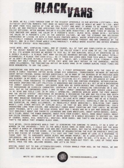 This weird, COVID-drenched world that is screaming for someone to unveil it as a spot of wonder in the universe—this is the world Black Vans is born into. I could say the book is about a bunch of cyberpunk kids who are fighting back. But you've read the book, you've seen it, and you know the score. So instead of regurgitating the plot or possibly spoiling bits and pieces of future issues, I'll just say that this labor of love is a response to those that try to subjugate queer Black and brown people, as a love-letter to all our influences, and as a proof of concept for the world we want to see. It's also, if I may be so un-humble as to say, a kick-ass, comic book punch-out fest! So, lace up those moon boots, pack the van, welcome aboard, and let's do this!