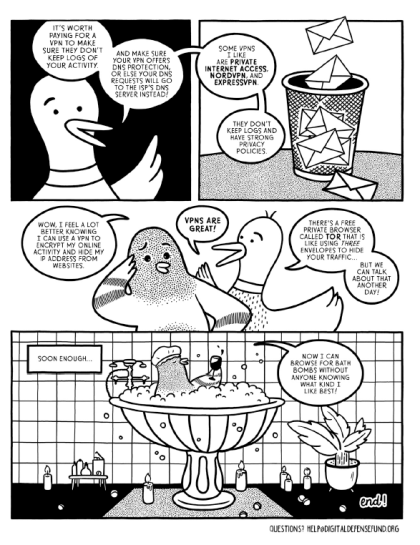Pigeon loves bath bombs, but doesn’t love the bath bomb ads that follow her around the Internet. How can she stop these invasive ads? And how can she prevent others from knowing what websites she is going to?