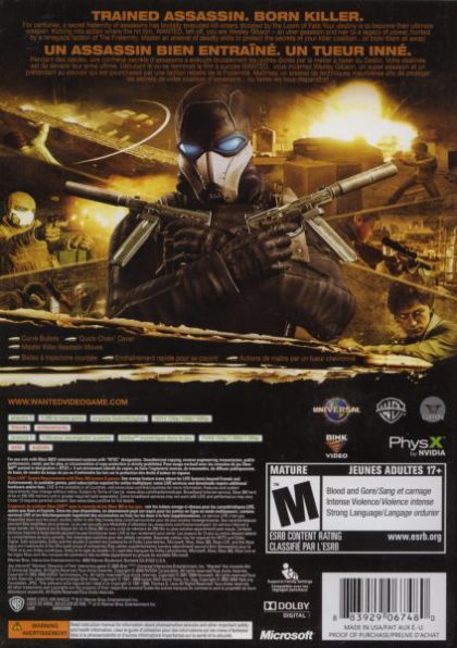 Based on Universal Pictures' action-thriller Wanted, this game promises to deliver the same fantastic visual style, in-your-face attitude and edge-of-your-seat action as the blockbuster motion picture. The game continues the story of hero Wesley Gibson, picking up the action where the film leaves off and creating an entirely new chapter exploring both Wesley's journey to becoming an unmatched überassassin and the epic fiction of "The Fraternity."