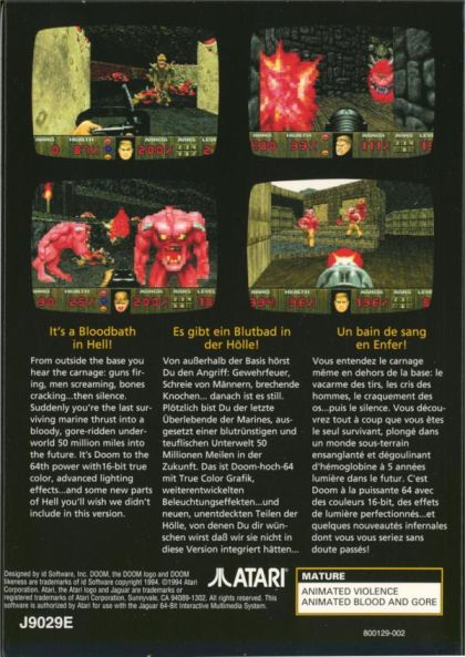 Jaguar Doom has the same levels from Doom1 as PSX Doom has. The Jaguar has 24/32bit color so the lighting is much better. It doesn't have the Cyberdemon or the Spider Mastermind. The frame rate is comparable to the PC version. The sound pitch is down slightly compared to the pc version. The music is in Mod format but only plays on intermission screens although it does contain most of the original score. Weapons were selected using the numeric keypad (like a telephone pad) on the standard controller (with overlay to see the everything). Map was also done like this. It has networking capabilities with both DM and Co-op for 2 players. There isn't any save game or password option but you can access any level you have completed from the main menu. The HUD is darker and rearranged, the area is displayed on the right. The ending is similar to Doom2.