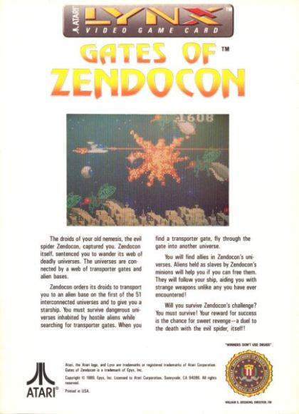 Gates of Zendocon is a 1989 action video game by Epyx for the Atari Lynx which was highly rated. This game is an action platform scrolling shooter where the player controls a space ship across 51 levels ("universes"). During gameplay there are a number of little alien allies to aid the player and protect the ship. The style of the game has an organic feel and the foes are numerous. There is a bonus level hidden inside the game where the player can earn high scores by destroying the faces of the game's creators.