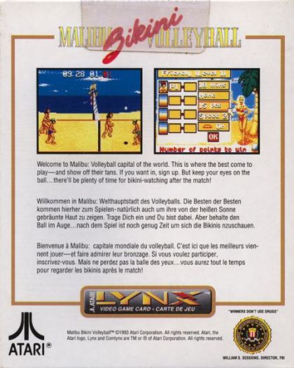 Having covered the mainstream sports (with varying degrees of success) for the Lynx game library, Atari now turns to the unconventional sports for their latest game. This is Malibu Bikini Volleyball, written by Handmade Software, which brings sand, surf, and scantily-clad members of both genders together for some two-on-two fun. You can serve, spike, and dive either in a three-round elimination tournament, or a single game with four difficulty levels. Options allow you to change the ball speed, turn indicator boxes and winds on or off, and set the score and time limits.