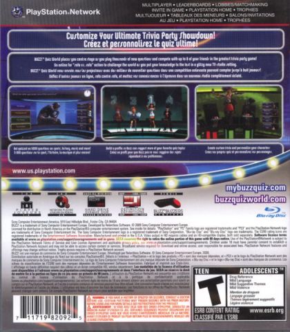 BUZZ! Quiz World for PS3 tests players' trivia talent with over 5,000 new questions, enhanced online multiplayer "Sofa vs. Sofa" action, and exciting new rounds and characters, all in a glitzy new TV-studio setting. Utilizing the fun and easy-to-use BUZZ! wireless Buzzers helps players to top off this totally immersive quiz show experience.