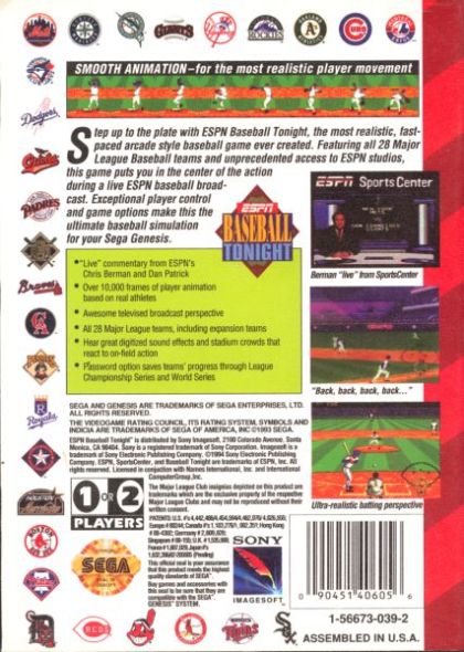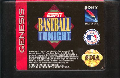 ESPN Baseball Tonight is a baseball game for the PC, Super NES, Sega Mega Drive/Genesis, and Sega [Mega-]CD. The game was licensed by MLB, but not by the Players Association, so while actual team names and logos are used, no player names are in the game.