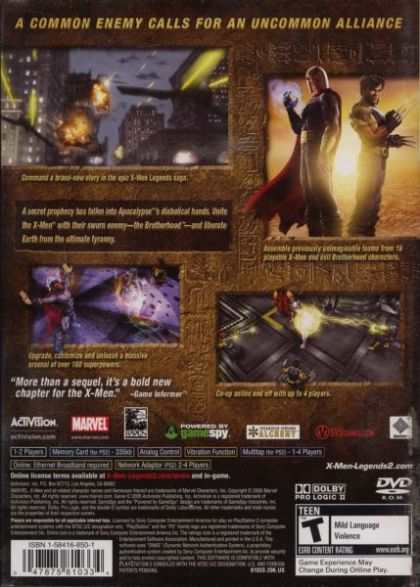 The sequel to the best-selling X-Men title ever, X-Men Legends, X-Men Legends II: Rise of Apocalypse is an all new action-RPG that lets players create, customize and control teams of four mutants from 16 all-time favorite X-Men and classic Brotherhood villains from the Marvel Universe. With the X-Men and Brotherhood fighting side by side for the first time, players switch instantly between teammates wielding many more super powers and skills than X-Men Legends, as they overcome obstacles, solve puzzles and defeat more than 100 types of enemies including Lady Deathstrike and the notorious Four Horsemen of Apocalypse. Delivering significant gameplay enhancements over the first title, X-Men Legends II: Rise of Apocalypse challenges players to explore immense, destructible environments set in classic X-Men locations like Genosha and the Infinite Factory, and exotic worldly locales like Egypt and the Savage Lands in both single player and, for the first time ever, online multiplayer modes.