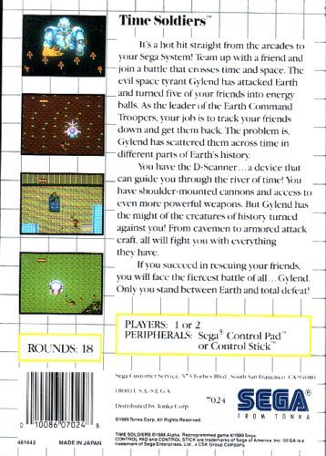 You are a Time Soldier, who is asked to rescue five warriors from different time periods: Sirius in the "Primitive Age", Laplace in the "Age of Rome", Dymos in "The World Wars", Alpha in the "Age of Rome", and Altair in "Future World". Each one of them is guarded by one of Gylend's henchmen, but to get to them, you must fight off other enemies that are specific to each time era. Some of these enemies will drop weapons that you can pick up and use. You can use several teleports scattered in each time era to travel to another.