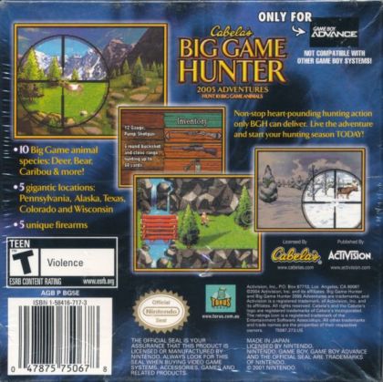 Hunters can sharpen their skills with the latest addition to the Big Game Hunter series. Cabela's Big Game Hunter delivers a compelling hunting game with 24 different North American big game animals, advanced animal behavior, and detailed landscapes. Play Career Hunt or jump right into the action with Quick Hunt for immediate satisfaction. Special features include bullet-cam, x-ray scopes, custom log cabin with a trophy room, and an advanced scoring system. Play the game as any good hunter must study his prey.
