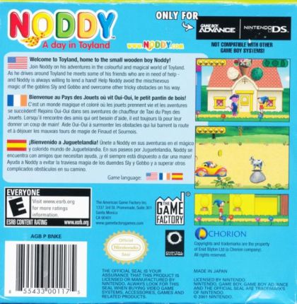 Noddy wakes up in his colourful building block house and starts his day with a smile. Driving around Toyland he meets several friends who are in need of help -and Noddy is always willing to lend a hand. Play and interact with Noddy and other favourite characters from Toyland including Big Ears, Mr. Sparks, Miss Pink Cat, Tessie Bear, Dinah Doll, Martha Monkey and Mr. Wobbly Man. Visit Big Ears or help Mr Sparks locate his tools or find Tessie Bear's dog and help her make delicious strawberry ice cream.