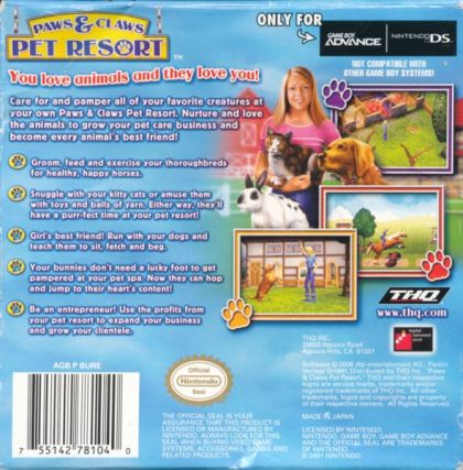 Paws & Claws: Pet Resort is a lackluster Game Boy Advance game running on DS. It's also the latest installment in THQ's Paws & Claws series, which has previously included Paws & Claws: Pet Vet, and Paws & Claws: Dogs & Cats Best Friends. Those two titles struggled to do anything truly notable in their respective simulation and virtual pet genres, and only ended up offering average gameplay experiences – but even average would be better than what this latest release brings to the table.