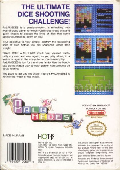 The goal of Palamedes is to clear the screen which is, line by line, filling up with dice. Players control a small person situated near the bottom of the screen, who can only be moved to the left or right. The number of the dice the person is holding can be changed with the B button, pressing the A button will shoot the dice upwards. If the die hits another one with a matching number, the targeted dice disappears from the playing area and is added to a column at the bottom of the screen. Pressing down after lining up at least three dice of either the same number or consecutive numbers in the bottom row will destroy up to five lines at once.