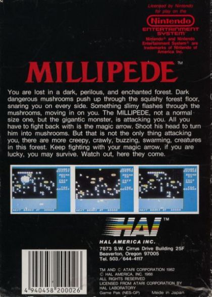 Millipede is the sequel to Centipede, and features similar gameplay, but with a new swarm of insects! The goal is to destroy the multi-segmented millipede as it traverses its way through the mushroom forest towards the bottom of the screen. When all millipede segments have been destroyed, the player will progress to the next, more difficult level. Millipedes and other creatures are all worth a different amount of points. Occasionally dynamite will appear on the screen, which will explode if shot by the bug zapper. With a well timed shot, numerous millipede segments (and other insects as well) can be taken out as they pass by.