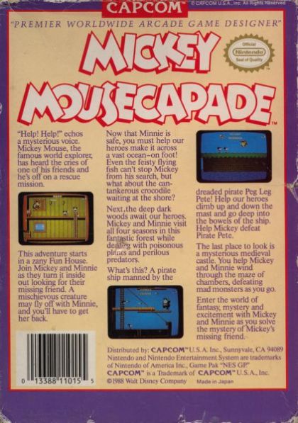 One of Mickey's friends is in trouble, and Mickey and Minnie Mouse are on a rescue mission! Mickey Mousecapade is an action platform game. In order to reach your goal (and find out which of Mickey's friends is in trouble), you'll need to jump and climb your way through various levels which take place in different locations (including a fun house, a treacherous sea side, a pirate ship, and a castle). Each screen has numerous obstacles and enemies which will drain your energy if you come in contact; lose all of your energy, and a life is lost and the game ends when you have no lives left. You control Mickey Mouse and Minnie follows along. You'll need to make sure Minnie stays safe as you make your way through the levels (for example, if you mistime a jump and Mickey lands safely but Minnie doesn't a life will be lost). In addition to avoiding obstacles, there is also some occasional puzzle solving (such as locating a key to open locked doors, or finding your way out of the woods).