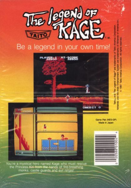 You play Kage, a skillful ninja in search of rescuing Princess Kiri from the hands of the warlord Yoshi. Armed only with a sword and 'star knives', you must fight your way through countless henchmen and the occasional boss to complete your task. Levels include the forest, moat, inside and outside of the castle. These levels repeat as the seasons change. The gameplay is side scrolling. Kage's moves include the ability jump extremely high in the air, grab and climb trees, block and attack with his sword, and throw shuriken. The game can be challenging at times though because the player dies in one hit. 2-players are supported, but must take turns.