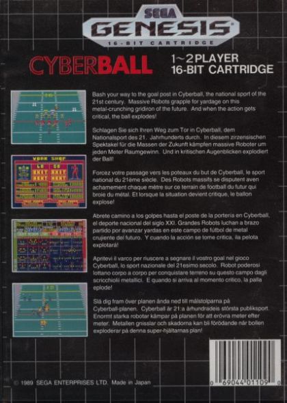 Cyberball is an Atari Games arcade game of 7-man American football, using robotic avatars of different speeds, sizes, and skill sets. The game replaced the standard downs system with an explosive ball that progresses from "cool" to "warm", "hot", and "critical" status as it is used. Players can only defuse the ball, resetting it from its current state back to "cool" by crossing the 50 yard line or by change of possession, whether through touchdown, interception or fumble. A robot holding a critical ball while being tackled is destroyed along with the ball. The robots also possess finite durability. As offensive units are tackled, they wear down, finally issuing smoke and then flames after a number of hits. A flaming robot will explode when hit, thereby fumbling the ball. Players can upgrade robots with faster and more durable units using money bonuses they earn during play. Players select from run, pass or option plays on offense, after which the computer presents four individual plays from which to choose. On defense, a player can select short, medium or long defenses, and then select a specific defensive scheme.