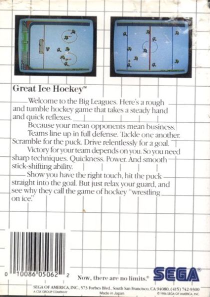 In Great Ice Hockey one must use the Sega Sports Pad to play the game. One must stroke the roller ball to try and pass, skate, shoot and score! The team that ends up with the most goals as regulation time runs out wins.