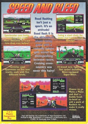 Road Rash II is the second game in a series of motorcycle-racing video games by Electronic Arts. It was released in 1993 for the Sega Mega Drive. It is based heavily on the engine and sprites of the first game. Road Rash II introduced several new features to the series, including bikes with nitrous oxide injection and varied weapons. It is hailed as the greatest of the Road Rash series by many.