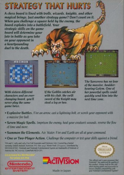 Archon can be played with either one or two players. The NES version, which was released a few years after the other versions, has improved graphics for the real-time combat part. Each type of square has it's own colored background and the unit sprites are larger.
