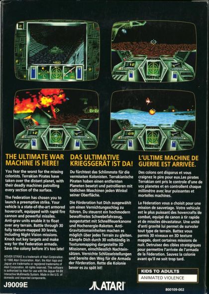 Hover Strike for the Jaguar is a mission-based tank game. In each mission, you will drop to the surface of the planet, destroy some targets, and then return to your ship in orbit. The hovercraft you pilot is heavily armored and includes various weapons systems to take out enemies and targets.