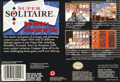 Super Solitaire is a SNES version of the classic solitaire card game with 12 varieties of play (Klondike, Free Cell, Golf, Cruel, Pyramid, Stonewall, Doesn't Matter, Aces Up, Florentine, Poker, Canfield and Scorpion). It features classic artwork for backgrounds along with optional cartoony graphics. Very soft music is included on the track. The game also sports options where you can choose to skip to the next card when stuck or get a hint on what to do.