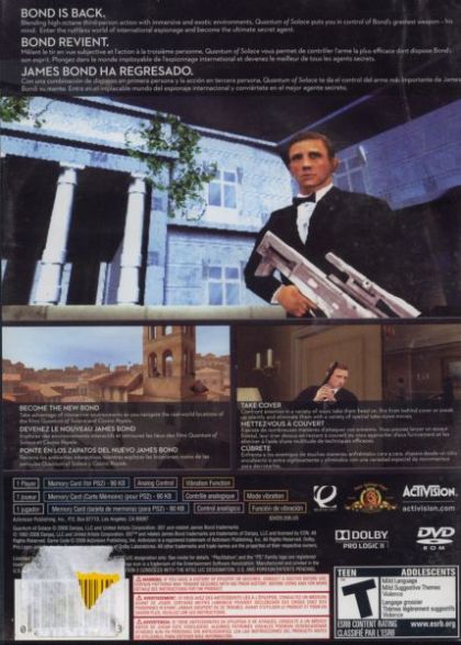 James Bond is back to settle the score in the Quantum of Solace game. Introducing a more lethal and cunningly efficient Bond, the game blends intense first-person action with a unique third-person cover combat system that allows players to truly feel what it is like to be the ultimate secret agent as they use their stealth, precision shooting and lethal combat skills to progress through missions. Seamlessly blending the heart-pounding action and excitement of the upcoming "Quantum of Solace" feature film with the "Casino Royale" movie, the title propels players into the cinematic experience of international espionage. Based on the renowned Call of Duty 4: Modern Warfare game engine that has been specifically engineered to immerse players in the Bond universe, the Quantum of Solace game delivers superior high-definition graphics, reactive AI and visually stunning locations inspired by locales portrayed in the films.