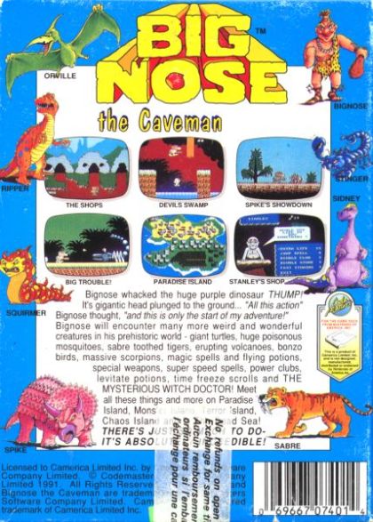 Big Nose the Caveman is a NES game made by Camerica that was released in 1991. It is a side scroller. In 1993-94, work was done in a port for the Sega Master System, but it was never released commercially, although a prototype version exists (with the title Dinobasher: Starring Bignose the Caveman).