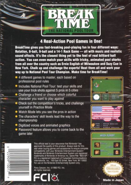 BreakTime: The National Pool Tour is a pocket billiards (pool) video game released for the Nintendo Entertainment System. There are four unique challenges in the game, eight-ball, nine-ball, rotation, and straight pool. All four are allegedly played according to the professional (i.e. world standardized) rules.