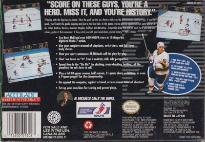 Brett Hull Hockey lets the player take control of NHL great Brett Hull along with 600 NHLPA players and all of the NHL teams of the time including their respective names and logos. The player can choose to play in an Exhibition mode either against the computer A.I. or a friend, Playoffs or in Season mode with three different length options (a full season, half a season or an 11-game season). The game simulates hockey action including slap shots, body checks, hat tricks among many other real-life hockey moves. Al Michaels also lends his voice talents to the game for in-game commentary.