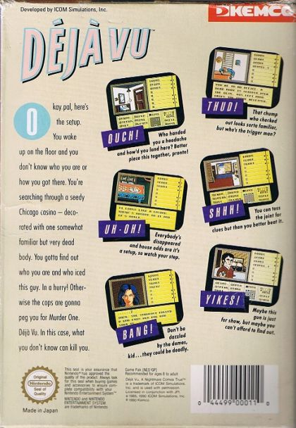 Deja Vu was the first game ever made by ICOM, the makers of such famous adventure games as Shadowgate and Uninvited. It featured mouse support, a multi-window interface, and bitmapped graphics at a time when text-based interactive fiction was the norm.