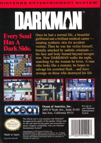 Based on the film by Sam Raimi. You play Peyton Westlake, returned from the dead as the many faced "Darkman", seeking your revenge against mobster Robert G.Durant. Live through all the high spots of the movie - the breathtaking helicopter fight sequence - the skyscraper shoot-out - dice with death as you swing into heaving freeway traffic dangling from a helicopter.