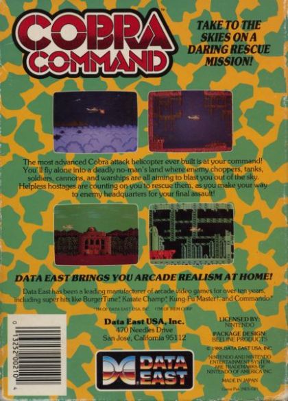 An arcade game from Data East, Cobra Command is a 2D, side-scrolling helicopter shooter in the tradition of Choplifter. Your mission: blast your way through six stages (Sumatra, Java, Borneo, South China Sea, Siam, and Enemy HQ) and rescue the hostages.